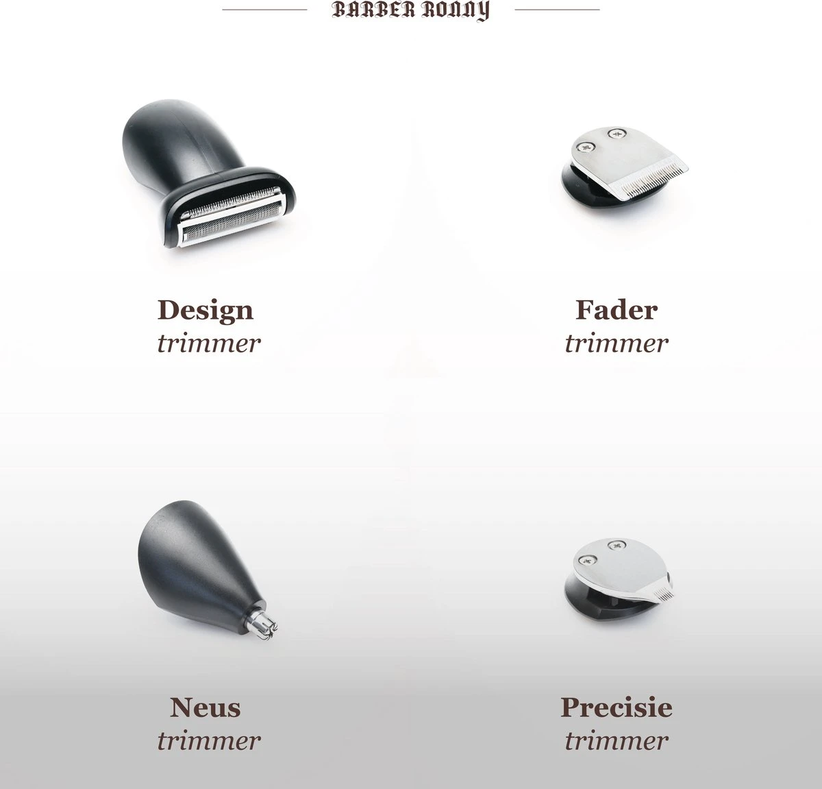 Bepaal zelf je favoriete baardlengte. Dankzij de meegeleverde opzetkammen hou je zowel een lange als korte baard perfect in vorm. Daarnaast heeft BarberRonny ook aan de rest van je look gedacht. De meegeleverde opzetmesjes bieden je tal van mogelijkheden om elke dag verzorgd uit de deur te stappen. Zo maakt de Neus- en Oortrimmer een einde aan onaantrekkelijke haren, terwijl de Design- en Precisietrimmer je helpen bij het creëren van de perfect afgelijnde baard. Met de Fader zet je de puntjes helemaal op de i.