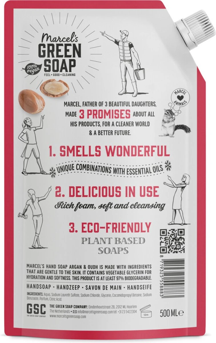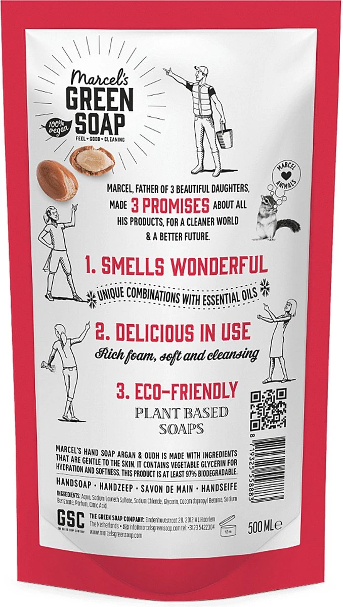 De handzeep argan & oudh is gemaakt van plantaardige zepen, minstens 97% biologisch afbreekbaar én verrijkt met plantaardige glycerine voor zachte handen. Zacht voor je huid én de planeet de handzeep van marcel is gemaakt met ingrediënten die niet alleen zacht zijn voor de huid, maar ook voor de planeet. Onze duurzame handzeep zit bomvol plantaardige ingrediënten, is minstens 97% biologisch afbreekbaar, 100% vegan en de flessen zijn gemaakt zijn van 100% gerecycled plastic. Wat wil je nog meer? een heerlijke geur? ook daar hebben we aan gedacht!