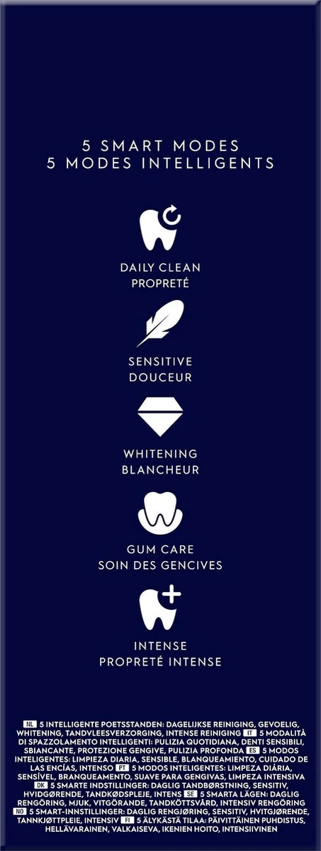 • 5 slimme poetsstanden om je poetsbeurt te personaliseren: Dagelijkse reiniging, Gevoelige tanden, Tandvleesverzorging, Intense reiniging, Whitening