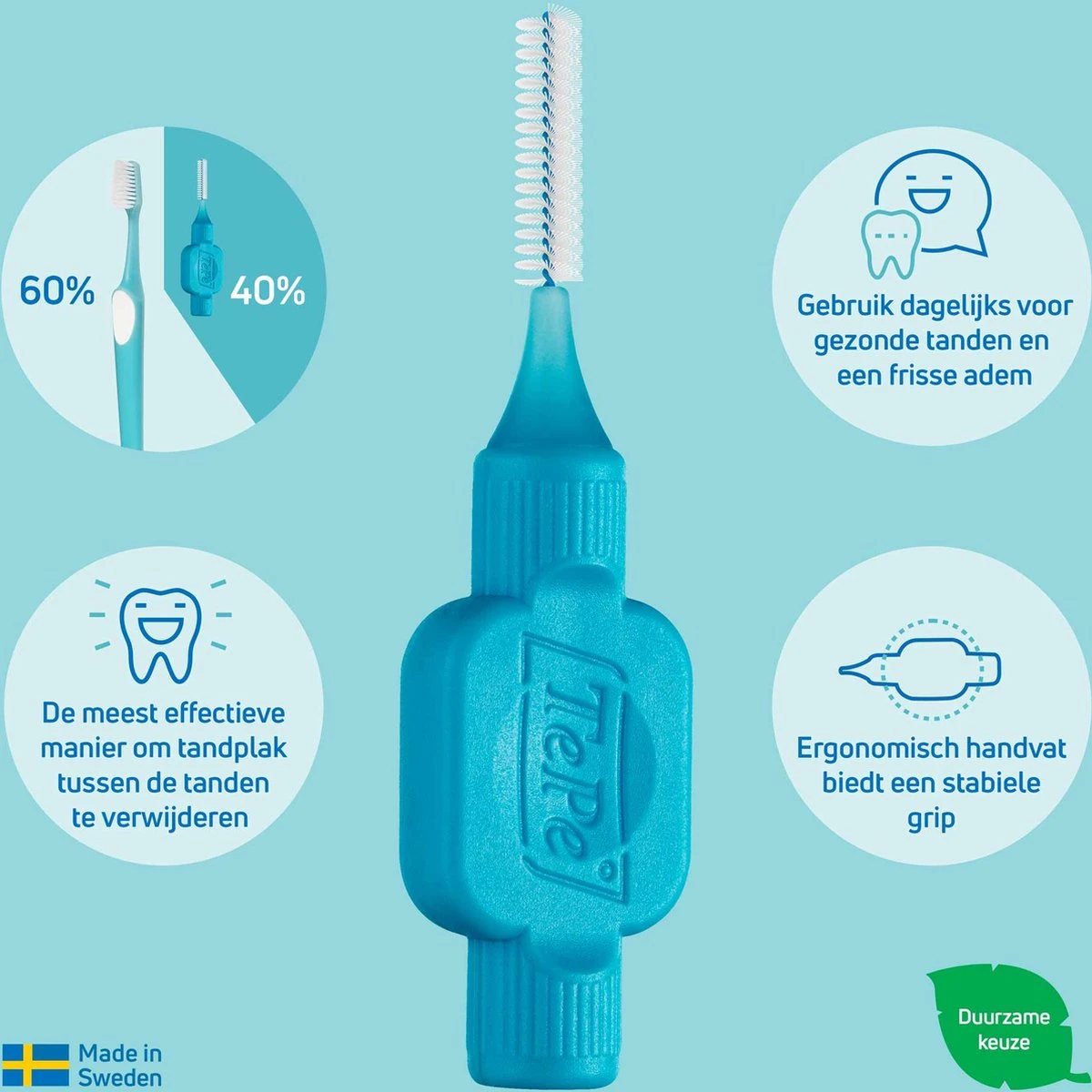 TePe Interdentale Ragers Original Blauw De duurzame interdentale ragers van TePe zijn ontworpen om de openingen tussen je tanden en kiezen te reinigen. Plekken waar je met een gewone tandenborstel meestal niet bij kan komen. Een rager kan gebruikt worden om tandplak en bacteriën tussen tanden, implantaten, kronen en bruggen optimaal te verwijderen. Op deze manier verminder je de kans op tandvleesontstekingen, gaatjes en een slechte adem. Productkenmerken• De meest effectieve manier om tussen je tanden te reinigen.• Een buigbare draad voor betere toegang• Met kunststof gecoate metaaldraad voor veiligheid en comfort• Gebruiksvriendelijk en ergonomisch handvat• Een tandenborstel verwijdert maar 60% tandplak, een interdentale rager verwijdert de overige 40%Kies de juiste maatDe ragers zijn beschikbaar van onze kleinste maat 0,4 mm (roze) tot 1,5 mm (zwart). Je hebt vaak meer dan één borstelmaat nodig. Je tandarts of mondhygiënist kan je helpen bij het kiezen van de juiste borstelmaat of -maten. Als je niet naar de tandarts of mondhygiënist kunt gaan onthoud dan dat een rager goed moet passen, maar nooit tussen de tanden moet worden geforceerd. Een kleine tip is om te beginnen met de kleinste maat; roze waarna je steeds een grotere maat kunt pakken totdat je de borstel tegen je tand en tandvlees voelt drukken. De blauwe rager van 0,6 mm is geschikt voor een gebit met smalle openingen tussen de tanden.GebruiksinstructiePlaats de rager voorzichtig tussen je tanden en kiezen. Beweeg de rager een paar keer over de hele lengte heen en weer. Spoel de borstel zowel tijdens als na gebruik af.